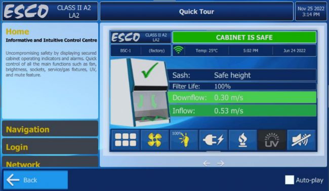2. 新一代生物安全柜采用Centurion觸摸屏設計,觸感靈敏易于操作、清潔和維護,其醒目的3D狀態(tài)標識(溫度、進風風速、下沉風速、可視化氣流流型、過濾器壽命、紫外燈壽命等)以及實時聲光報警3D提示畫面,方便直接向操作者反饋不良信息并及時處理問題。可調LED燈,使用者可根據自身情況觸摸調整燈光強度,保護視力從而實現最佳工作舒適度。
