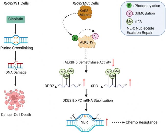 KRAS突變通過ERK/JNK信號通路誘導ALKBH5的磷酸化(Ser325)和SUMO化(Lys86和Lys321),抑制其去甲基化酶活性。這些修飾導致m6A修飾水平升高,特別是與核苷酸切除修復(NER)相關的基因(如DDB2和XPC)。