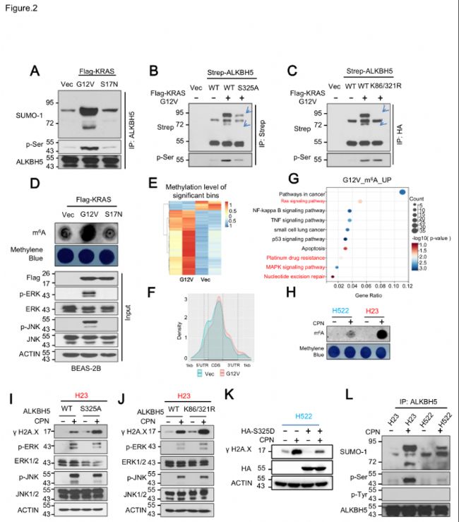 圖2. KRAS組成性激活突變通過調節ALKBH5磷酸化和SUMO化調控整體mRNA m6A甲基化。
