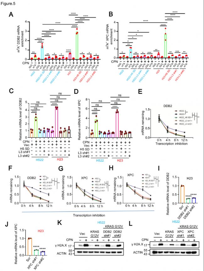 L-M. MeRIP分析表明KRAS G12V過表達誘導的DDB2和XPC轉錄本的m6A甲基化水平上調可被METTL3缺失賴抑制。