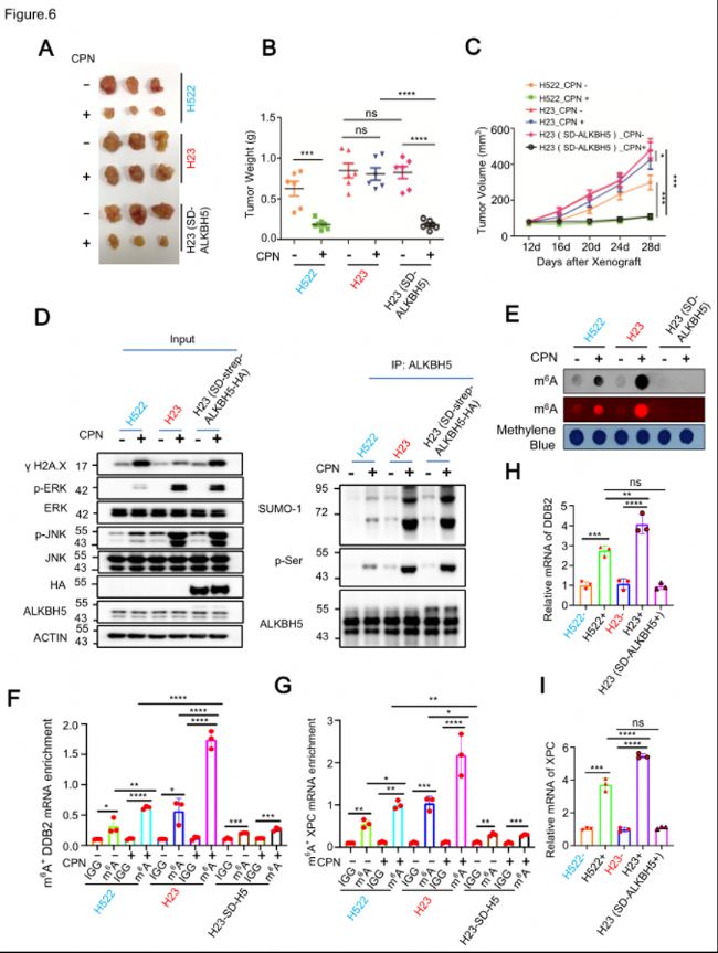 在裸鼠移植瘤模型中,KRAS突變型NSCLC細胞對順鉑耐藥,而過表達SUMO化缺陷型ALKBH5或抑制METTL3可以逆轉耐藥性。這些結果表明,抑制m6A修飾可以增強KRAS突變型NSCLC細胞對鉑類藥物的敏感性。