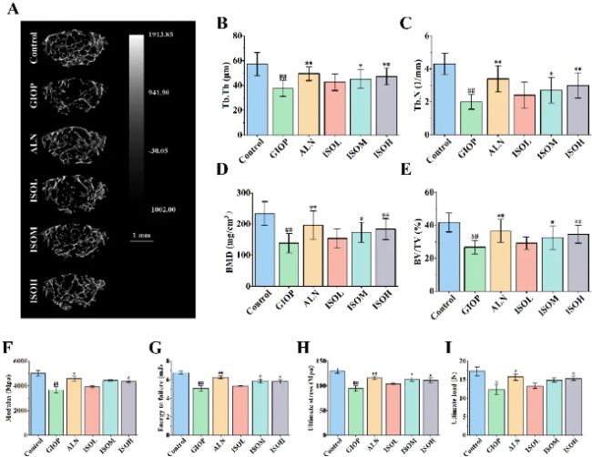 Micro-CT結果顯示,與對照組相比,GIOP小鼠的Tb.Th, Tb.N, BMD和BV/TV 顯著減少。然而,在ALN和ISO干預后,GIOP小鼠的這些指標表現出不同程度的改善,其中ALN和ISOH組的改善最為顯著(圖1A-1E)。