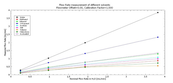 在技術研究報告中,用在純凈水中校準的儀器,測量不同溶劑情況下的表觀流量,對HPLC流量計性能有效性的證據進行了評估。