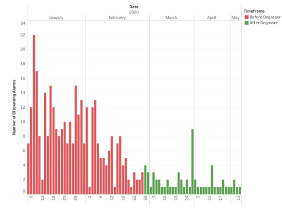他補充道:“我們實施的Teflon®AF膜連續線內脫氣解決方案有效地去除了試劑溶液中的溶解氣體,從而大大提高精度,并將分配誤差降低77%。在安裝兩個DEGASI PLUS系統之前,試劑盒制造商觀察到2%的樣品存在顯著的分配誤差。安裝我們的線內脫氣系統從根源上消除了這種分配誤差”。