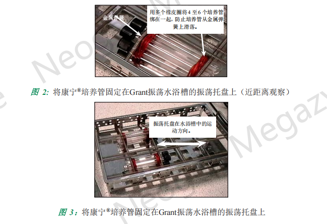 iii. 旋緊管蓋,將試管置于旋渦混合器上混合均勻,然后將試管沿振蕩器運動方向水平排列,放置在振蕩水浴槽中(見第 11 頁圖 2 和圖 3)。