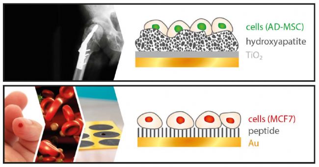 圖1. 用于骨科假體開發(fā)的干細胞(AD-MSC)在陶瓷羥基磷灰石表面的結合情況已被確定(圖1上)。乳腺癌細胞(MCF7)與靶肽的結合情況已被測量,以開發(fā)從血液樣本中檢測癌癥的生物傳感器(圖1下)。
