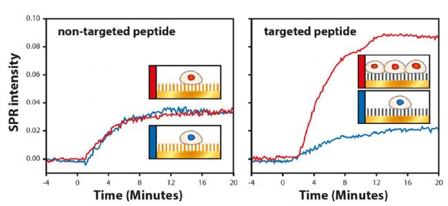 同時,BioNavis開發(fā)了一種生物傳感器用于檢測腫瘤細胞。測量了乳腺癌細胞(MCF7)和非癌細胞(MCF-10A)與一種表面結合的靶向肽(18-4)以及一種參考肽的結合情況。該生物傳感器表面能夠區(qū)分癌細胞與正常細胞。
