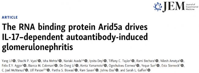 文章題目:The RNA binding protein Arid5a drives IL-17-dependent autoantibody-induced glomerulonephritis