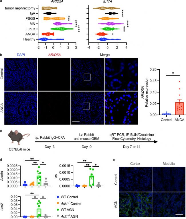ARID5A在人組織中的表達:分析歐洲腎臟cDNA數據庫(European Renal cDNA Bank)發現IL17RA mRNA在多種AGN中表達升高。類似地ARID5A mRNA也在多種AGN(如IgA腎病、ANCA相關性腎炎等)中顯著上調。采用RNAScope原位雜交對腎組織進行活檢,結果表明在ANCA-GN患者中ARID5A的表達也顯著升高。