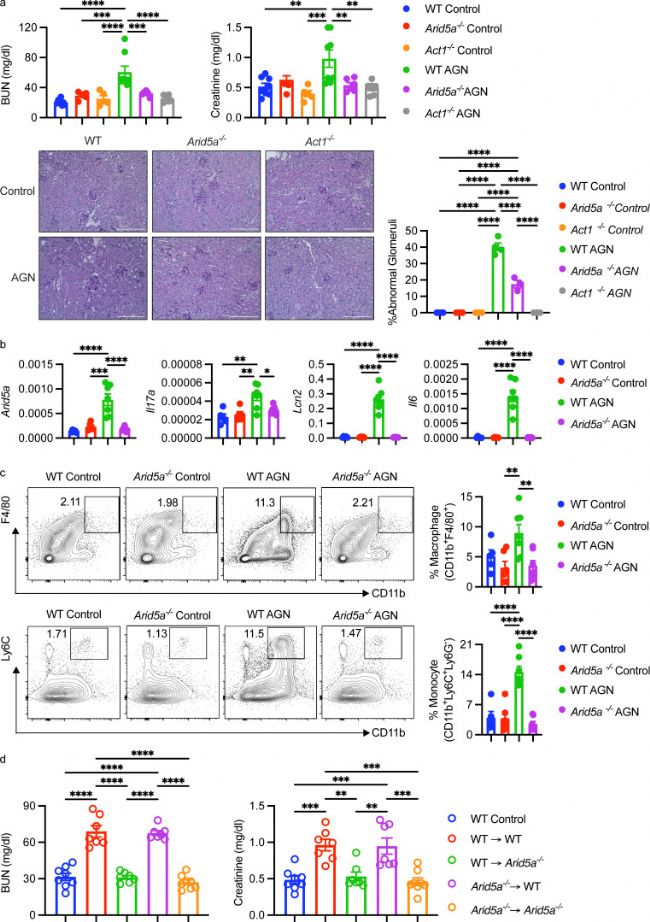 腎功能保護:ARID5A缺失的小鼠誘導AGN后,腎功能指標(如血尿素氮BUN和肌酐)顯著低于野生型小鼠,表明ARID5A缺失能夠保護腎臟免受AGN的損害。