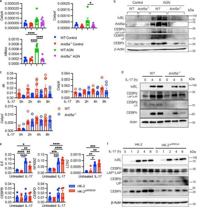 IL-17誘導的C/EBP蛋白積累:在體外實驗中,IL-17刺激后,ARID5A缺失的RTECs中C/EBPβ和C/EBPδ的蛋白水平顯著降低,進一步證實了ARID5A在IL-17依賴性C/EBP蛋白積累中的關鍵作用。