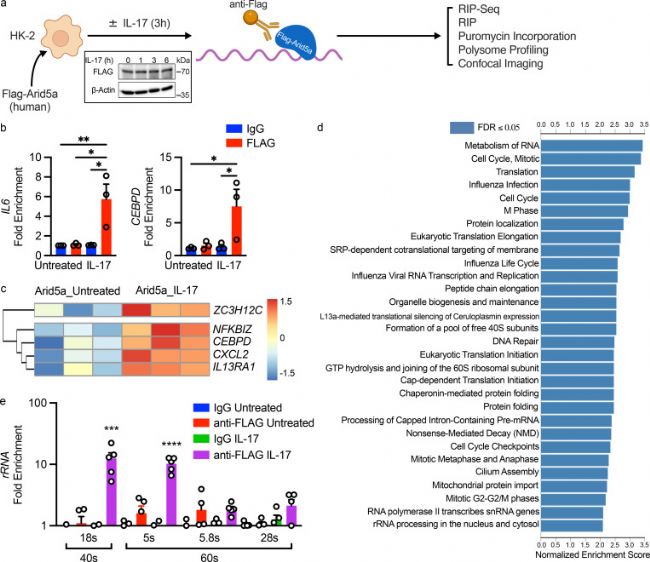 RIP-Seq分析:通過RNA免疫沉淀測序(RIP-Seq),研究人員發現ARID5A在IL-17刺激后與多種RNA結合,其中包括炎癥相關mRNA(如CEBPD、NFKBIZ)以及核糖體RNA(rRNA)和翻譯相關RNA。