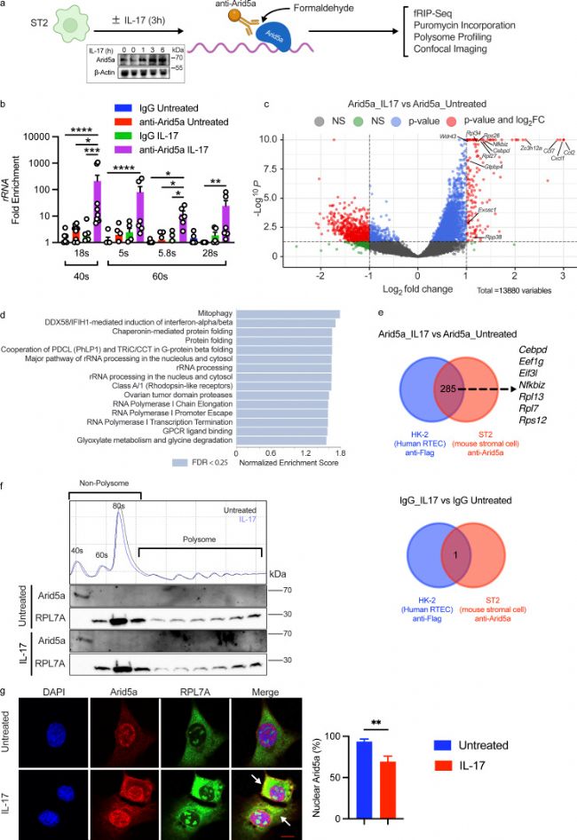 ARID5A功能在ST2細胞中的驗證:在IL-17敏感的ST2細胞中,ARID5A同樣表現出與核糖體的相互作用,并調控炎癥因子的翻譯。RIP-Seq分析顯示,ARID5A在ST2細胞中結合的RNA靶點與HK-2細胞中的結果高度一致,進一步驗證了ARID5A在IL-17信號通路中的保守功能。