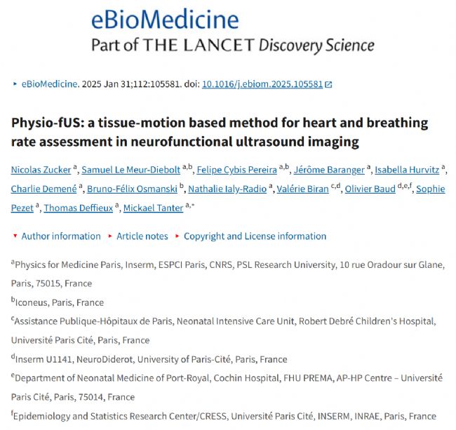 [1] N. Zucker, S. Le Meur-Diebolt, F. Cybis Pereira, J. Baranger, I. Hurvitz, C. Demené, B.-F. Osmanski, N. Ialy-Radio, Valérie Biran, O. Baud, S. Pezet, T. Deffieux and M. Tanter, Physio-fUS: a tissue-motion based method for heart and breathing rate assessment in neurofunctional ultrasound imaging, eBiomedicine, 2025, 112: 105581DOI:10.1016/j.ebiom.2025.105581
