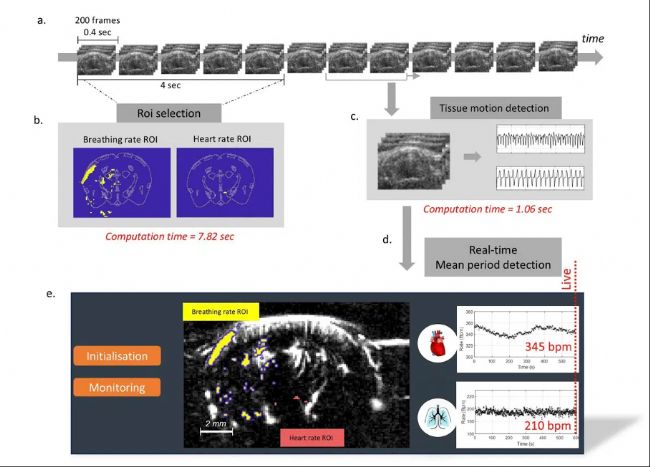 圖2:在功能性超聲(fUS)神經(jīng)成像實(shí)驗(yàn)中,為實(shí)現(xiàn)實(shí)時(shí)的心率與呼吸率監(jiān)測(cè),研究團(tuán)隊(duì)所設(shè)計(jì)的數(shù)據(jù)處理流程
