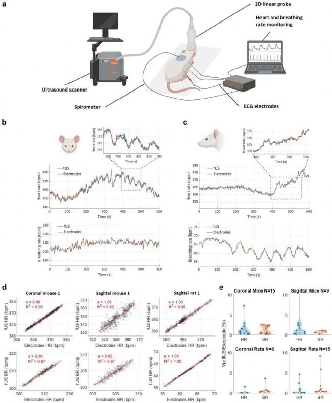 圖3:fUS 與電極的同步表明其在麻醉嚙齒動(dòng)物中可實(shí)現(xiàn)精準(zhǔn)且可靠的心率與呼吸頻率監(jiān)測(cè)