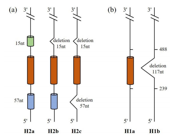 圖1 H1和H2亞基不同的剪切異構體 (a)H2的剪切異構體 (b)H1的剪切異構體(來源:人體去唾液酸糖蛋白受體的檢測)
