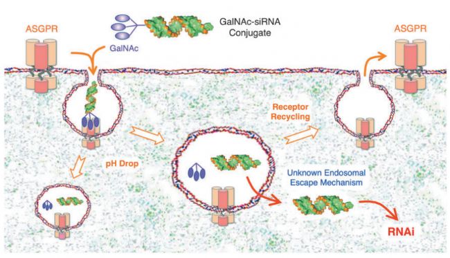 圖2 GalNAc-siRNA偶聯(lián)物與ASGPR結合及細胞內遞送過程(來源:GalNAc-siRNA Conjugates: Leading the Way for Delivery of RNAi Therapeutics)