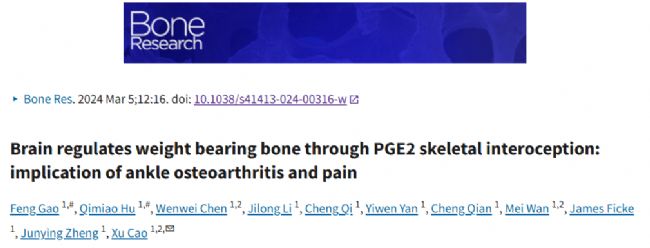 參考文獻(xiàn):Gao F, Hu Q, Chen W, Li J, Qi C, Yan Y, Qian C, Wan M, Ficke J, Zheng J, Cao X. Brain regulates weight bearing bone through PGE2 skeletal interoception: implication of ankle osteoarthritis and pain. Bone Res. 2024 Mar 5;12(1):16. doi: 10.1038/s41413-024-00316-w. PMID: 38443372; PMCID: PMC10914853.