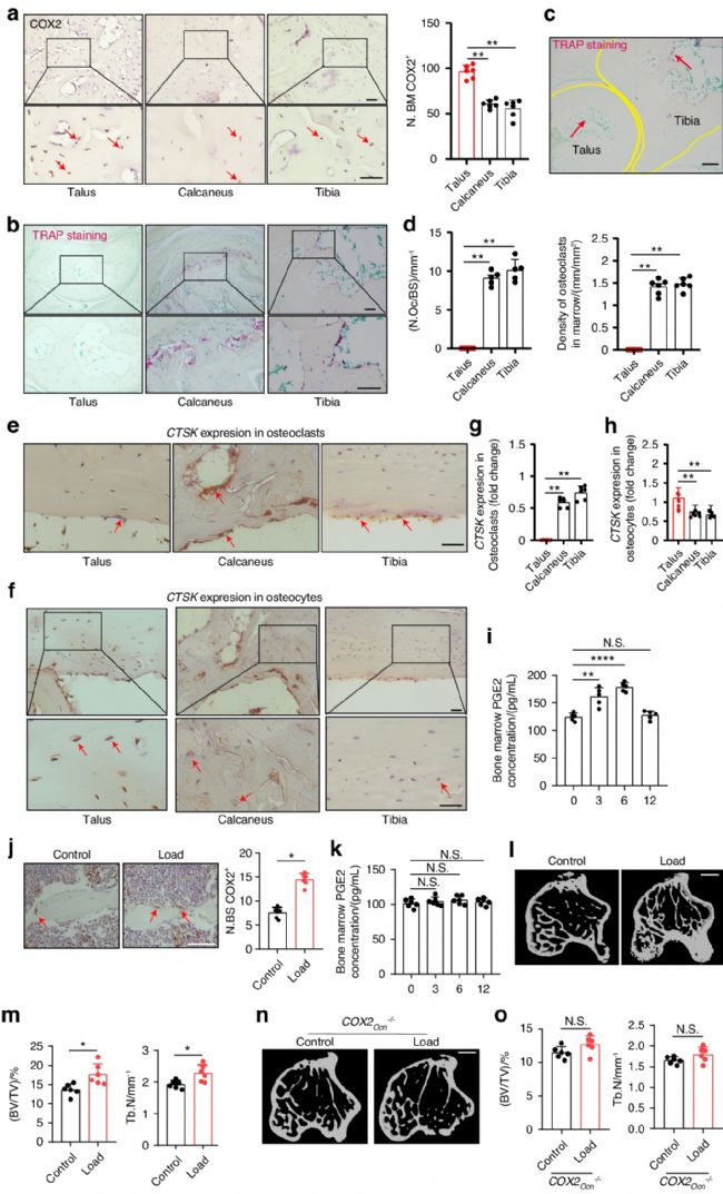 COX2是 PGE2 的關(guān)鍵限速生物合成酶,因此檢測了COX2是否介導(dǎo)骨形成。研究發(fā)現(xiàn),距骨中COX2的表達(dá)明顯高于脛骨和跟骨(圖1 a)。值得注意的是,距骨中幾乎沒有 TRAP 染色,而成年小鼠的脛骨和跟骨則有相對較強(qiáng)的染色(圖1 b),這與每個骨表面的破骨細(xì)胞數(shù)量(N.Oc/BS)和骨髓中破骨細(xì)胞密度的顯著差異相關(guān)(圖1 c、d)。組織蛋白酶K(CTSK)由破骨細(xì)胞高度表達(dá)和分泌,是其骨吸收活性所必需的,也在骨細(xì)胞中表達(dá)(圖1 f)。此外,跟骨和脛骨中觀察到相當(dāng)數(shù)量的穩(wěn)態(tài) CTSK+ 破骨細(xì)胞,但在距骨中沒有觀察到(圖1 e、g),而免疫組化顯示距骨、跟骨和脛骨中的 CTSK+ 骨細(xì)胞處于穩(wěn)態(tài)(圖1 f、h)。這些結(jié)果可能表明,骨細(xì)胞中的 CTSK 調(diào)節(jié)距骨表面重塑。這些發(fā)現(xiàn)證明,在生理?xiàng)l件下,距骨中的 PGE2 介導(dǎo)獨(dú)立于破骨細(xì)胞的骨重塑。
