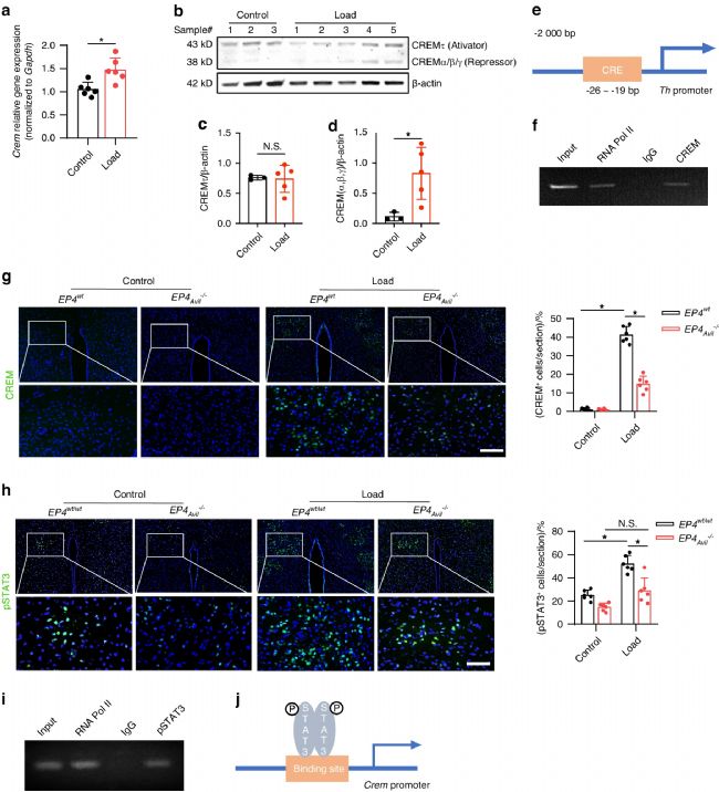 由 Crem 基因編碼的 CREM 是 CRE 介導(dǎo)的基因轉(zhuǎn)錄的內(nèi)源性調(diào)節(jié)劑。Crem 基因以其產(chǎn)生多種選擇性剪接的轉(zhuǎn)錄物變體而著稱,包括 CREMτ、CREMα、CREMβ、CREMγ 和 ICER,每個變體具有不同的功能。為了確定機(jī)械負(fù)荷是否增加下丘腦中 CREM 的表達(dá)以調(diào)節(jié) Th 基因表達(dá),通過RT-PCR 測量了機(jī)械負(fù)荷后小鼠 PVN 中 Crem mRNA 的表達(dá),發(fā)現(xiàn)與非負(fù)荷對照組相比,負(fù)荷小鼠的 Crem mRNA 表達(dá)顯著升高(圖3 a),其中轉(zhuǎn)錄抑制性 CREMα、β 和 γ,而非轉(zhuǎn)錄激活性 CREMτ,的表達(dá)水平更高(圖3 b-d)。進(jìn)一步研究發(fā)現(xiàn),機(jī)械負(fù)荷誘導(dǎo) CREM 與 Th 啟動子的 CRE 結(jié)合位點(diǎn)特異性結(jié)合(圖3 e、f)。此外,通過對下丘腦切片進(jìn)行免疫染色,發(fā)現(xiàn)機(jī)械負(fù)荷的EP4wt 小鼠中PVN 中 CREM 的表達(dá)顯著增加,且這種效應(yīng)在 EP4Avil–/– 小鼠中急劇減少(圖3 g)。這些結(jié)果表明,機(jī)械負(fù)荷通過 ARC-PVN 回路激活 PGE2-EP4 介導(dǎo)的骨骼內(nèi)感受信號,以誘導(dǎo) PVN 中的 CREM 表達(dá)以抑制 TH 表達(dá),從而抑制交感神經(jīng)驅(qū)動。