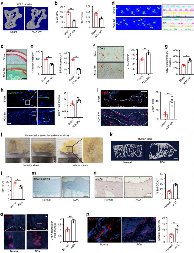 最后,研究測試了感覺神經(jīng)支配是否由 PGE2 啟動并與 AOA 相關(guān)疼痛相關(guān)。建立AOA 和踝關(guān)節(jié)疼痛的小鼠模型,發(fā)現(xiàn)在 12 周齡 AOA 小鼠中,骨髓(BV/TV)和骨小梁參數(shù)均顯著降低(圖4 a、b),距骨腔周圍有綠色染色的骨基質(zhì)(圖4 c),表明手術(shù)后 8 周距下關(guān)節(jié)明顯退變。此外,野生型小鼠AOA術(shù)后2個月右后爪同側(cè)強(qiáng)度百分比和兩肢接觸面積(圖4 d、e)與假手術(shù)對照組相比存在顯著差異。AOA 中骨細(xì)胞中 COX2 的表達(dá)高于假手術(shù)對照(圖4 f)。重要的是,AOA 小鼠的 CGRP+ 神經(jīng)絲密度和距骨中的 PGE2 水平明顯高于假手術(shù)組(圖4 h、g),表明手術(shù)會導(dǎo)致機(jī)械負(fù)荷增加,進(jìn)而導(dǎo)致 PGE2 水平升高。此外,與假手術(shù)小鼠相比,AOA 小鼠骨細(xì)胞中 CTSK 的表達(dá)顯著增加(圖4 i),表明 CTSK 活性與距骨中的 CGRP+ 感覺神經(jīng)支配有關(guān)。