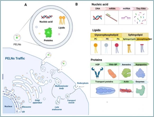 根據(jù)目前的研究,植物外泌體的生物發(fā)生有三種可能的途徑(圖3):外囊陽性細(xì)胞器(EXPO)途徑、多泡體(MVBs)途徑和液泡途徑。其中,MVBs途徑被認(rèn)為是PELNs形成的主要途徑。基本過程包括質(zhì)膜向內(nèi)出芽以形成早期內(nèi)體,這些內(nèi)體成熟并與反式高爾基體網(wǎng)絡(luò)通信,形成MVBs。MVBs內(nèi)的腔內(nèi)囊泡(ILV)可以包含各種物質(zhì),如RNA、DNA、脂質(zhì)等。MVBs與質(zhì)膜融合后,ILV可釋放到細(xì)胞外間隙,形成PELNs。該途徑與已知的哺乳動物來源外泌體(MDEs)的生物發(fā)生途徑高度相似。EXPO途徑涉及形成類似于自噬體的雙膜結(jié)構(gòu),它可以與質(zhì)膜融合,向細(xì)胞壁釋放單膜囊泡。液泡途徑主要發(fā)生在植物防御真菌病原體期間。感染后,液泡與質(zhì)膜融合并釋放其水解酶和防御蛋白的內(nèi)容以抵消病原體的入侵。它們在植物的生長、發(fā)育和應(yīng)對外界環(huán)境變化的過程中逐漸形成和釋放。植物細(xì)胞的細(xì)胞壁結(jié)構(gòu)和復(fù)雜的胞內(nèi)環(huán)境賦予了植物外泌體獨特的生成條件。