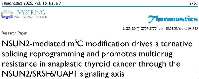 Hou X, Dong Q, Hao J, Liu M, Ning J, Tao M, Wang Z, Guo F, Huang D, Shi X, Gao M, Li D, Zheng X. NSUN2-mediated m5C modification drives alternative splicing reprogramming and promotes multidrug resistance in anaplastic thyroid cancer through the NSUN2/SRSF6/UAP1 signaling axis. Theranostics 2025; 15(7):2757-2777. doi:10.7150/thno.104713.