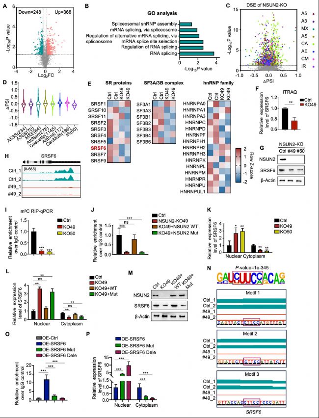 蛋白質組學分析顯示,NSUN2敲除后,與RNA剪接相關的蛋白表達發生顯著變化,其中SRSF6蛋白表達顯著下調,而其mRNA水平不變。