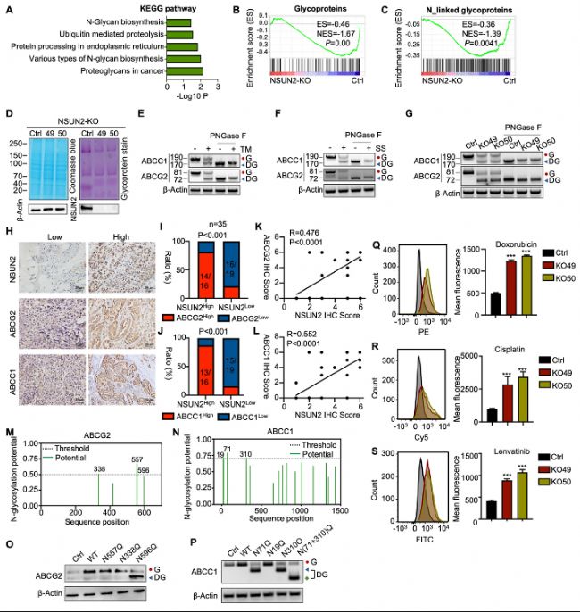 圖4:NSUN2通過增強ABC轉運蛋白的N-糖基化促進ATC中的MDR。