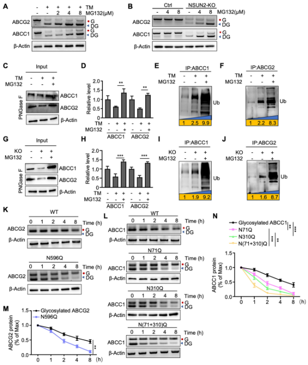 通過western blot 分析和泛素化實驗,發現NSUN2敲除后,ABCC1和ABCG2的泛素化水平增加,表明N-糖基化缺失導致這些蛋白更容易被降解。