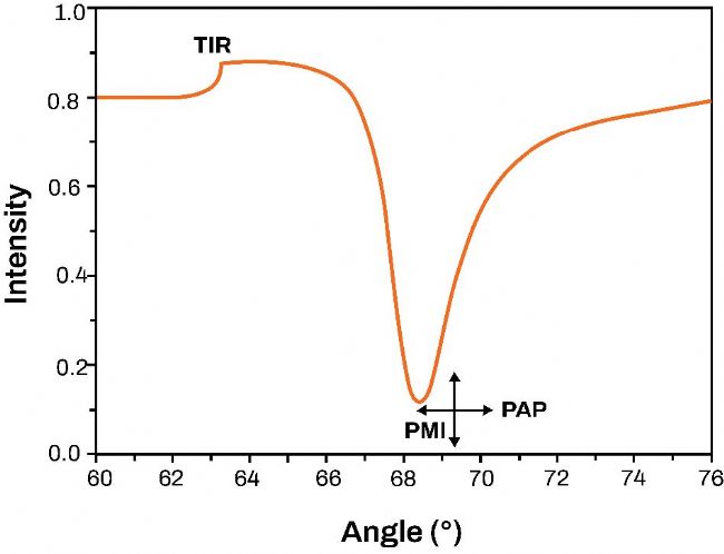 圖1. MP-SPR 能夠持續(xù)測量完整的表面等離子共振(SPR)曲線,并且能夠?qū)崟r追蹤多個參數(shù),包括峰值角度位置(PAP)、峰值最小強度(PMI)以及全內(nèi)反射(TIR)角度。