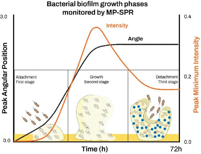 圖2. 通過MP-SPR(波長670納米)監(jiān)測的金黃色葡萄球菌原位生物膜生長階段(原位監(jiān)測)。黑色和橙色線條分別表示峰值角度位置(PAP)和峰值最小強度(PMI)隨時間的變化情況。ΔPMI表示細菌增殖后的階段,這是由于細胞外基質(zhì)(ECM)的產(chǎn)生和形成均勻?qū)铀隆?/span>