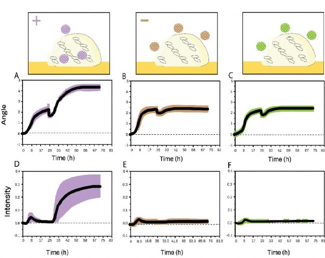圖3. 在金黃色葡萄球菌細菌生物膜生長及不同帶電荷納米粒子相互作用期間,ΔPAP(上圖)和ΔPMI(下圖)的實時MP-SPR響應(yīng)的平均值。A&D)帶正電荷的納米粒子,B&E)負載SUC的帶負電荷納米粒子,C&F)帶中性ACA功能化的納米粒子。