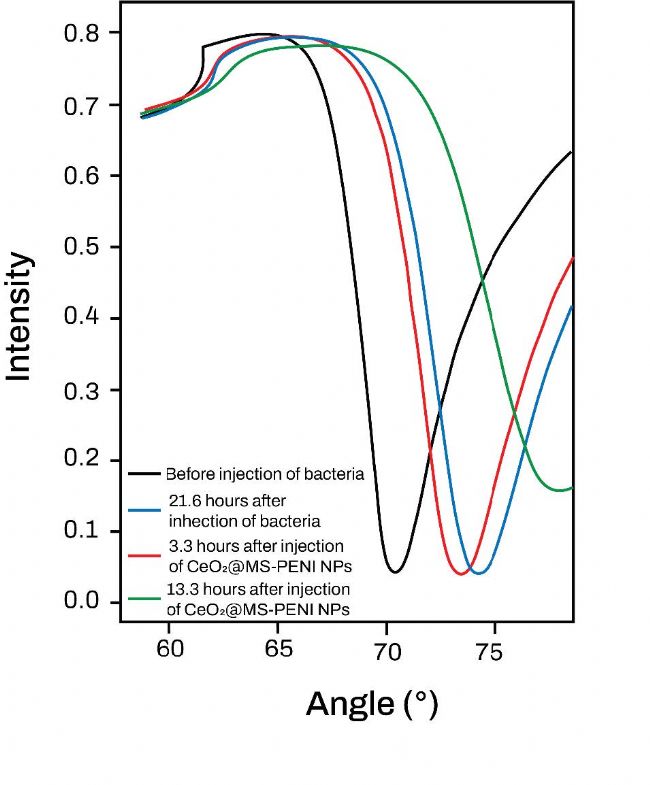 圖4. MP-SPR所提供的獨特且完整的SPR曲線測量能夠不僅追蹤峰值角度的變化,還能追蹤強度參數(shù),這對于本研究至關(guān)重要。完整的MP-SP曲線(在5分鐘時)在注入細菌之前(黑色),細菌注入開始后21.6小時(藍色),注入正電荷PEI包覆納米顆粒開始后3.3小時(紅色,圖3中時間為25小時)和13.3小時(綠色,圖3中時間為35小時)的時刻。