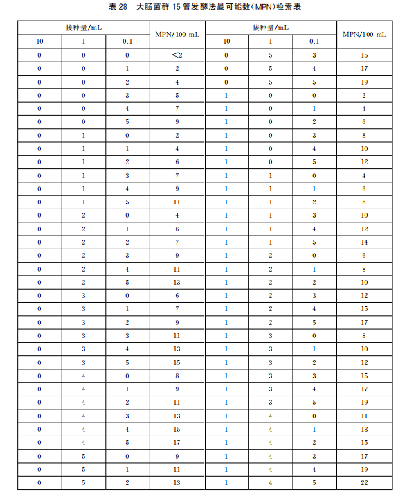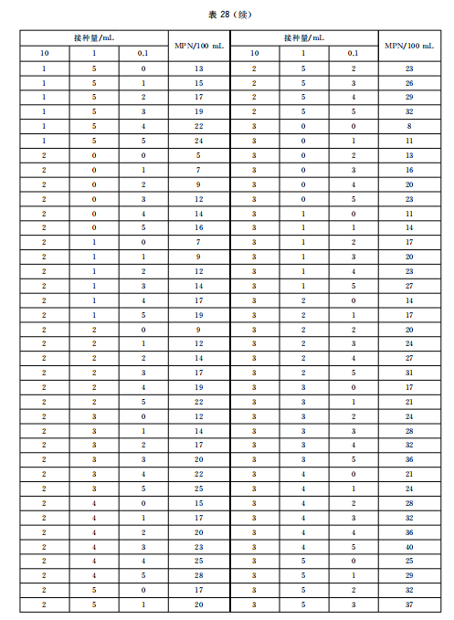 作為初發酵試驗結果為 5-4-2。當把以上陽性管轉種到亮綠乳糖膽鹽培養液管里,經培養后,若確證試驗所給的結果為 5-3-1,那么査表 28,可得出每 100 mL,水樣中大腸菌群的 MPN 值為 110。接種量為1 mL,0.1 mL,0.01 mL時,MPN值為1100。