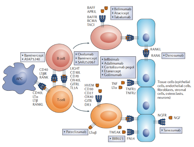 上圖突出顯示了免疫系統中(抗原呈遞細胞(APC)、B細胞和T細胞)以及組織細胞(如上皮細胞、內皮細胞、成纖維細胞、基質細胞、破骨細胞和神經元)之間的一些可能的相互作用。這些細胞可以通過腫瘤壞死因子超家族(TNFSF)和腫瘤壞死因子受體超家族(TNFRSF)分子之間的相互作用進行控制,從而產生典型的自身免疫和炎癥性疾病的刺激或促炎活性。