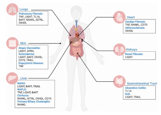 TNFSF家族與人體的一些疾病。來源:Frontiers in immunology