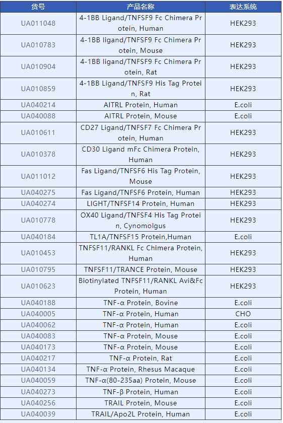 目前,已經鑒定出19種TNFSF配體,它們分別是TNF-α、TNF-β(也稱為LT-α)、CD40L、FasL、TRAIL、RANKL等。這些配體在結構上具有高度的相似性,但在功能上卻各有側重,通過與不同的受體結合,參與調節多種生物學過程。
