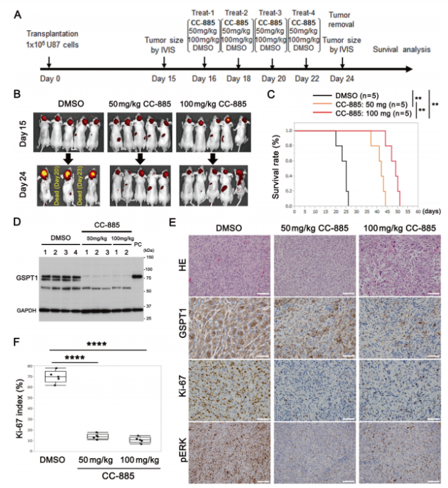 移植、CC-885 給藥和使用體內(nèi)成像系統(tǒng) (IVIS) 評(píng)估腫瘤大小的圖表。B 在第 15 天和第 24 天使用 IVIS 評(píng)估腫瘤大小。C 繪制了從移植到死亡的存活期(x 軸)和存活率(y 軸)。n = 5。**P = 0.0021(DMSO vs. 50 mg/kg CC-885),**P = 0.0021(DMSO vs. 100 mg/kg CC-885),和**P = 0.0044(50 vs. 100 mg/kg CC-885),采用 Kaplan–Meier 方法和對數(shù)秩檢驗(yàn)。D 在第 24 天使用 GSPT1 抗體通過免疫印跡 [n = 3(50 mg/kg CC-885)、2(100 mg/kg CC-885)和 4(DMSO)] 評(píng)估 CC885 對腦腫瘤中 GSPT1 表達(dá)水平的影響。通過使用 GAPDH抗體的免疫印跡確認(rèn)蛋白質(zhì)的比較負(fù)載。E 通過免疫染色評(píng)估 CC-885 對腦腫瘤的影響。移植的腦腫瘤(WT、經(jīng) CC-885 處理的 WT)在第 24 天被移除、固定并嵌入石蠟中。使用 GSPT1、Ki-67 和磷-ERK1/2 抗體對樣品進(jìn)行蘇木精-伊紅 (HE) 染色和免疫染色(蘇木精復(fù)染)。n = 5;比例尺:100 μm(HE、GSPT1 和 pERK)和 50 μm(Ki-67)。使用 ImageJ 軟件測量腦腫瘤中的 F Ki67 免疫染色指數(shù),并繪制 Ki67 指數(shù)。****P < 0.0001,通過單因素方差分析和 Tukey 事后檢驗(yàn)。