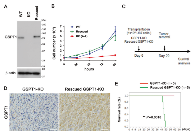2.制備GSPT1基因敲除(KO)的U87細(xì)胞和穩(wěn)定過表達(dá)FLAG標(biāo)記GSPT1的GSPT1-KO U87細(xì)胞(Rescued GSPT1-KO),并將其移植到裸鼠腦中,比較它們與野生型(WT)U87細(xì)胞的生存期。