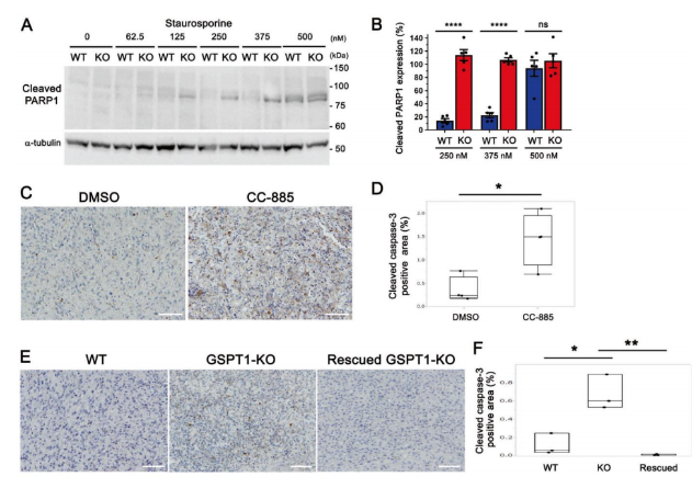 GSPT1-KO U87細(xì)胞對凋亡的敏感性。A、B、WT和GSPT1-KO U87膠質(zhì)母細(xì)胞瘤細(xì)胞在62.5-500 nM濃度的斯塔烏羅辛(staurosporine)作用下9小時(shí)。為了評(píng)估細(xì)胞凋亡,WT和GSPT1-KO U87細(xì)胞裂解液通過抗PARP1抗體進(jìn)行免疫印跡(A)。在每種斯塔烏羅辛濃度(250、375和500 nM)下,PARP1的裂解片段通過α-微管蛋白進(jìn)行歸一化并繪制(B)。C-F、將WT U87細(xì)胞或經(jīng)CC-885處理的WT U87細(xì)胞(C,第24天)以及WT、GSPT1-KO或恢復(fù)的GSPT1-KO U87細(xì)胞(E,第20天)移植到腦腫瘤中。將樣本從體內(nèi)取出,固定并包埋在石蠟中。使用抗cleaved caspase-3抗體進(jìn)行免疫染色。