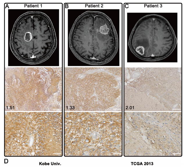 A-C 展示了3名患者腦膠質(zhì)瘤樣本的GSPT1蛋白表達(dá)情況。上層圖為釓增強(qiáng)的MR圖像。中間和下層圖展示了GSPT1免疫染色與蘇木精復(fù)染的顯微照片。患者1為60歲男性,腫瘤位于右側(cè)額葉前部。患者2為64歲男性,腫瘤位于左側(cè)額葉。患者3為59歲男性,腫瘤位于右側(cè)頂葉。GSPT1在腦膠質(zhì)瘤細(xì)胞的胞漿中表達(dá)。值得注意的是,GSPT1在血管細(xì)胞中不表達(dá)。患者1和2的GSPT1表達(dá)較強(qiáng);然而,患者3的GSPT1表達(dá)較弱至中等。每個(gè)顯微照片底部左方的數(shù)字代表GSPT1 mRNA在實(shí)時(shí)RT-PCR分析中的相對表達(dá)值。GSPT1免疫染色水平與相對mRNA表達(dá)值之間無相關(guān)性。上層圖尺度條為100微米(上層圖)和50微米(下層圖)。D 比較了GSPT1免疫染色水平與GSPT1 mRNA相對表達(dá)值之間的關(guān)系。Kaplan-Meier曲線顯示根據(jù)膠質(zhì)母細(xì)胞瘤樣本中GSPT1的mRNA表達(dá)水平將患者分為兩組。將87例膠質(zhì)母細(xì)胞瘤患者按照GSPT1表達(dá)值的中位數(shù)進(jìn)行分組。GSPT1high:GSPT1表達(dá)值高于中位數(shù)。GSPT1low:GSPT1表達(dá)值低于中位數(shù)。左側(cè)圖:神戶大學(xué)醫(yī)院的數(shù)據(jù)集。右側(cè)圖:TCGA膠質(zhì)母細(xì)胞瘤2013(https://www.cbioportal.org/)的數(shù)據(jù)集,可自由獲取。