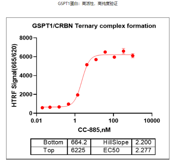 The GSPT1 activity was detected using HTRF technology. The reaction was performed by incubating the GSPT1 protein, CRBN and varying concentration of CC-885 and beads at 25℃ for 60 min, then reading ratio 665/620 on BMG.