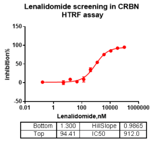 The CRBN/DDB1 activity was detected using HTRF technology. The reaction was performed by incubating the varying concentration of lenalidomide, CRBN/DDB1 protein, substrate and beads at 25℃ for 60 min, then reading ratio 665/620 with BMG.