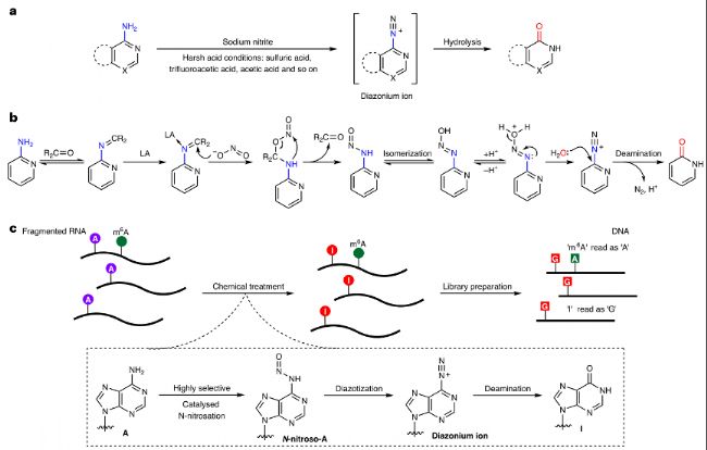 RNA和DNA中的化學修飾在多種生物過程中發揮著關鍵作用,包括轉錄調控、RNA降解、蛋白質翻譯和免疫調節等。這些修飾已被新的測序方法以單堿基分辨率定量地繪制出來,其中核苷酸脫氨基是一種高效策略,用于選擇性地繪制DNA中的5-甲基胞嘧啶(5-methylcytosine)和RNA中的N6-甲基腺苷(m6A)。然而,傳統的化學脫氨基方法依賴于在苛刻的酸性條件下使用芳基重氮鹽,這限制了其在大多數生物底物中的應用。近年來,基于亞硝酸鹽離子的RNA測序方法(如NO-seq和NT-seq)雖然簡單且成本效益高,但低轉化效率和苛刻的酸處理可能會導致RNA降解,從而影響檢測的準確性。此外,GLORI方法雖然提高了脫氨基效率和選擇性,但仍受到RNA降解和逆轉錄停止的限制,需要大量的RNA輸入。