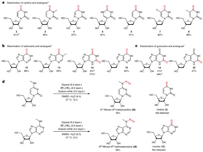 研究者在溫和條件下對多種核苷酸底物進行了脫氨基反應,發現甘油醛與硼酸三氟化物乙醚(BF3·OEt2)組合能高效脫氨基廣泛的核苷酸底物。通過改變羰基催化劑,從二羰基有機催化劑改為單羰基有機催化劑(如糠醛),可以顯著提高鳥苷類似物的脫氨基產率。研究者推測這可能是因為鳥苷類似物在位置6處可以與甘油醛環化,形成鳥苷-甘油醛加合物。