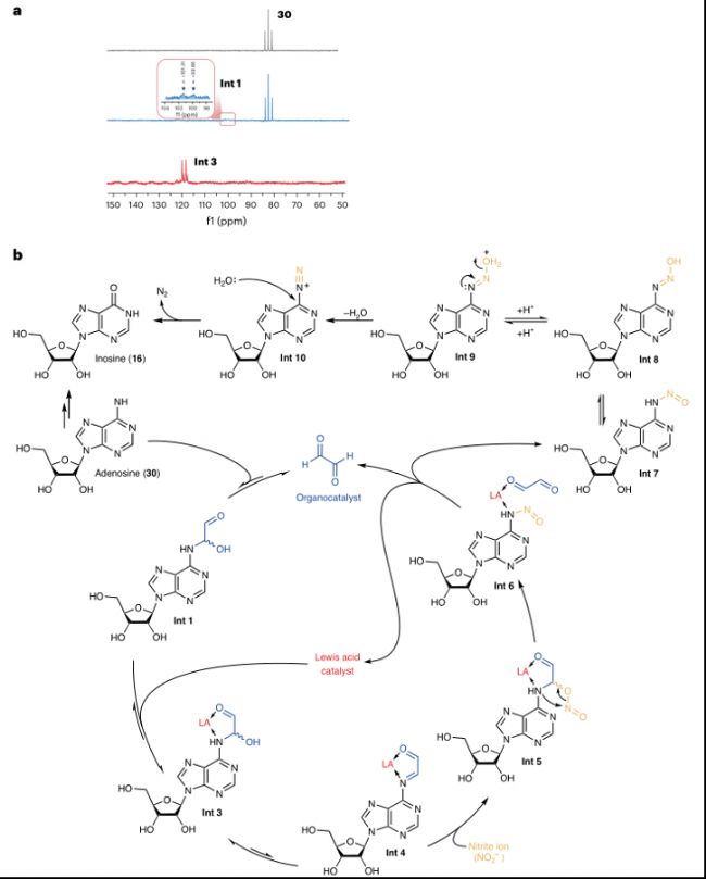 通過15N核磁共振(NMR)光譜學跟蹤反應過程,研究者發現,在沒有路易斯酸的情況下,15N6腺苷與甘油醛的縮合反應非常緩慢,即使在50℃下加熱2小時后,縮合產物的形成仍然很少。然而,加入BF3·OEt2后,15N標記的腺苷在半小時內迅速轉化為中間體Int 3。二維1H-15N HMBC光譜學被用來監測路易斯酸催化的縮合反應,具有更高的15N靈敏度。在Na15NO2存在的情況下,15N亞胺信號消失,表明其轉化為脂肪族硝基取代的中間體,并隨后重排為N-亞硝化加合物。這些結果證實了通過亞胺中間體的反應路徑。