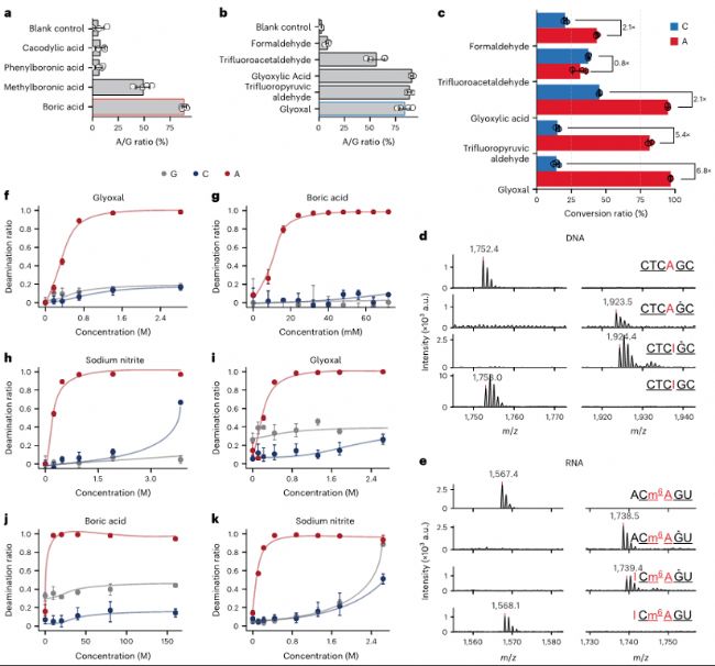 i-k. LC–MS/MS監測RNA寡核苷酸脫氨基反應中甘油醛(i)、硼酸(j)和亞硝酸鹽(k)濃度的優化(n=3)。