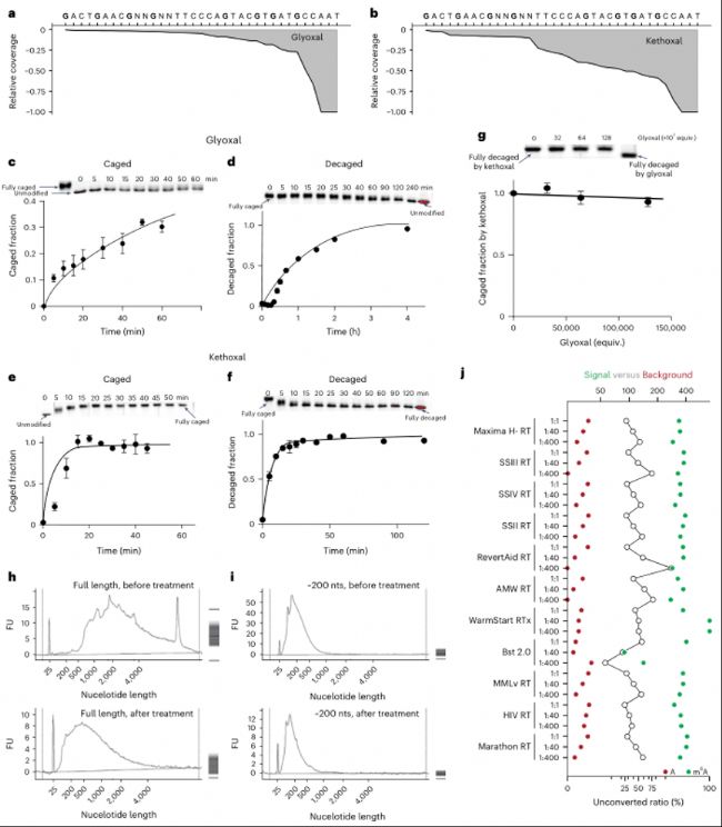 c-f. 在中性條件下,使用甘油醛(c,d)和kethoxal(e,f)對DNA寡核苷酸的籠化(caging)(c,e)和去籠化(decaging)(d,f)動態比較。